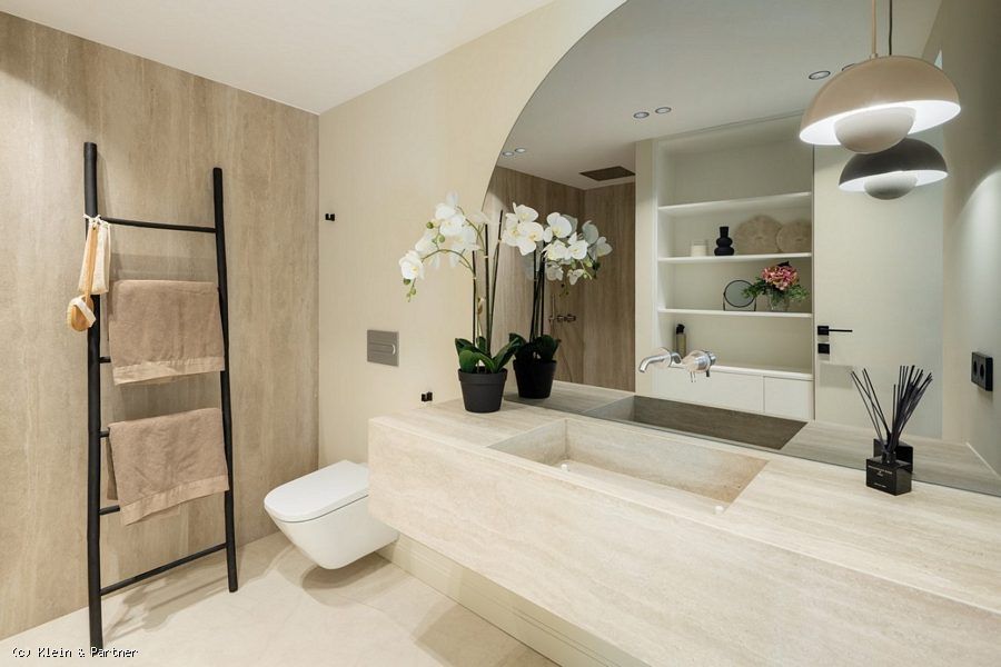 Two en-suite bedrooms are also situated on this level. The upper floor is reserved for the master suite, which is divided into two sections: a relaxation area with access to a private terrace, and a generous dressing room featuring a shower room next to the window, a vanity unit, double sinks, and access to another terrace with an outdoor bathtub.